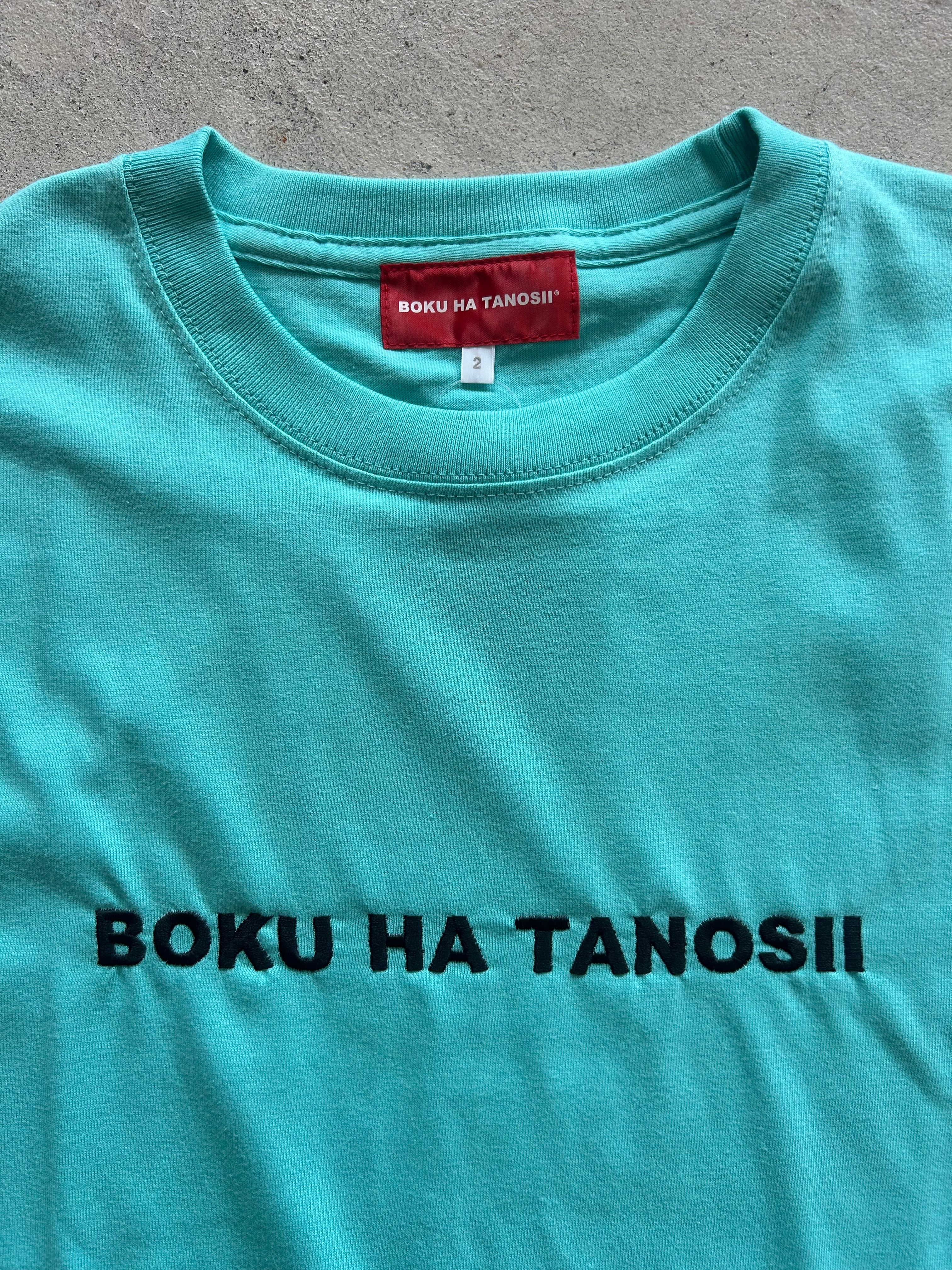 ティファニーブルーボディにブラック刺繍で施されたBOKU HA TANOSII