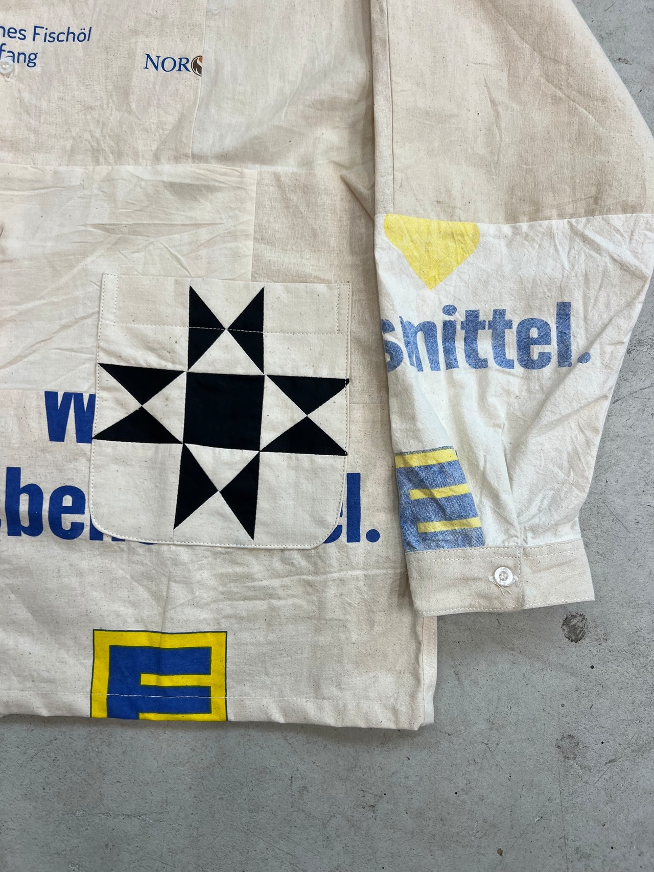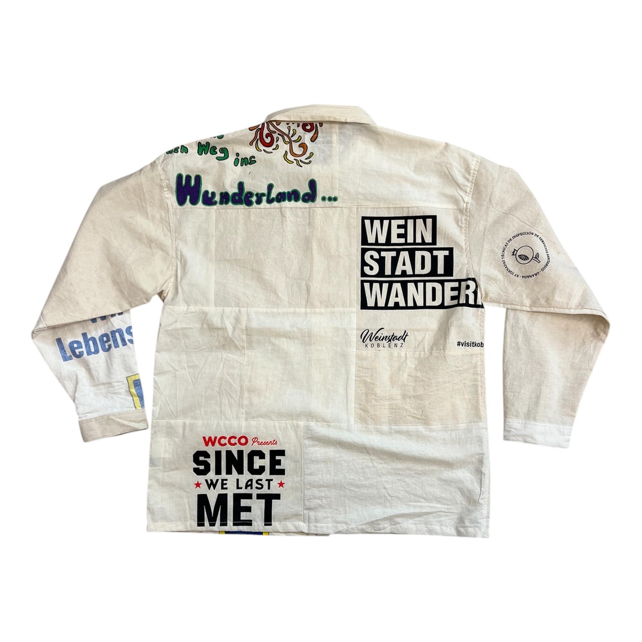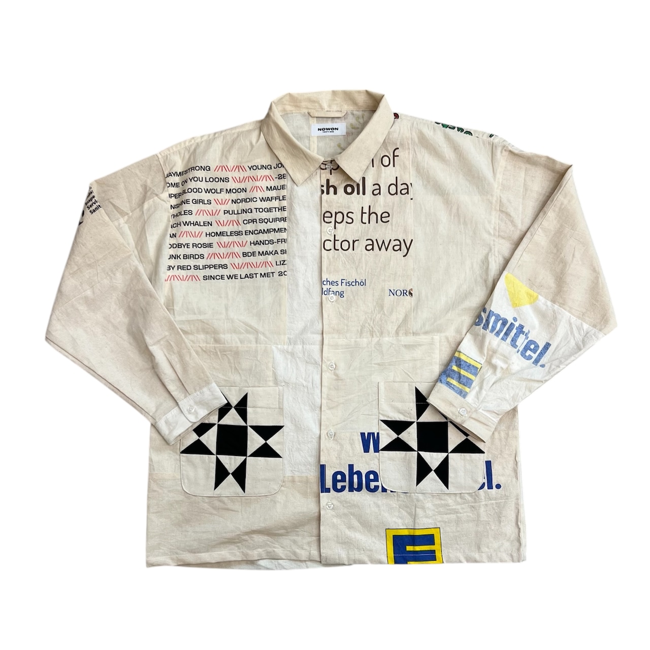 NOWON REMAKE "SOUVENIR BAG COVERAL SHIRT "のご紹介です!こちらはスーベニアバッグを活かしてリメイクされたカバーオール型のシャツです。お土産用エコバッグの魅力を再構築し、唯一無二のアイテムとして仕上げました。