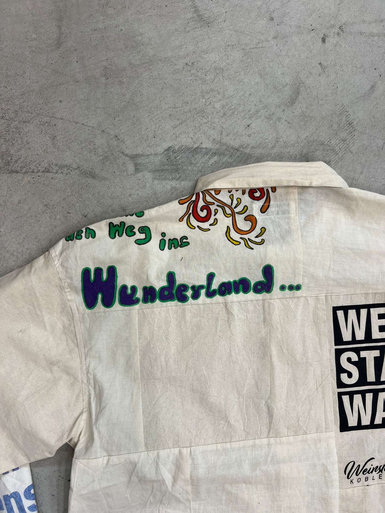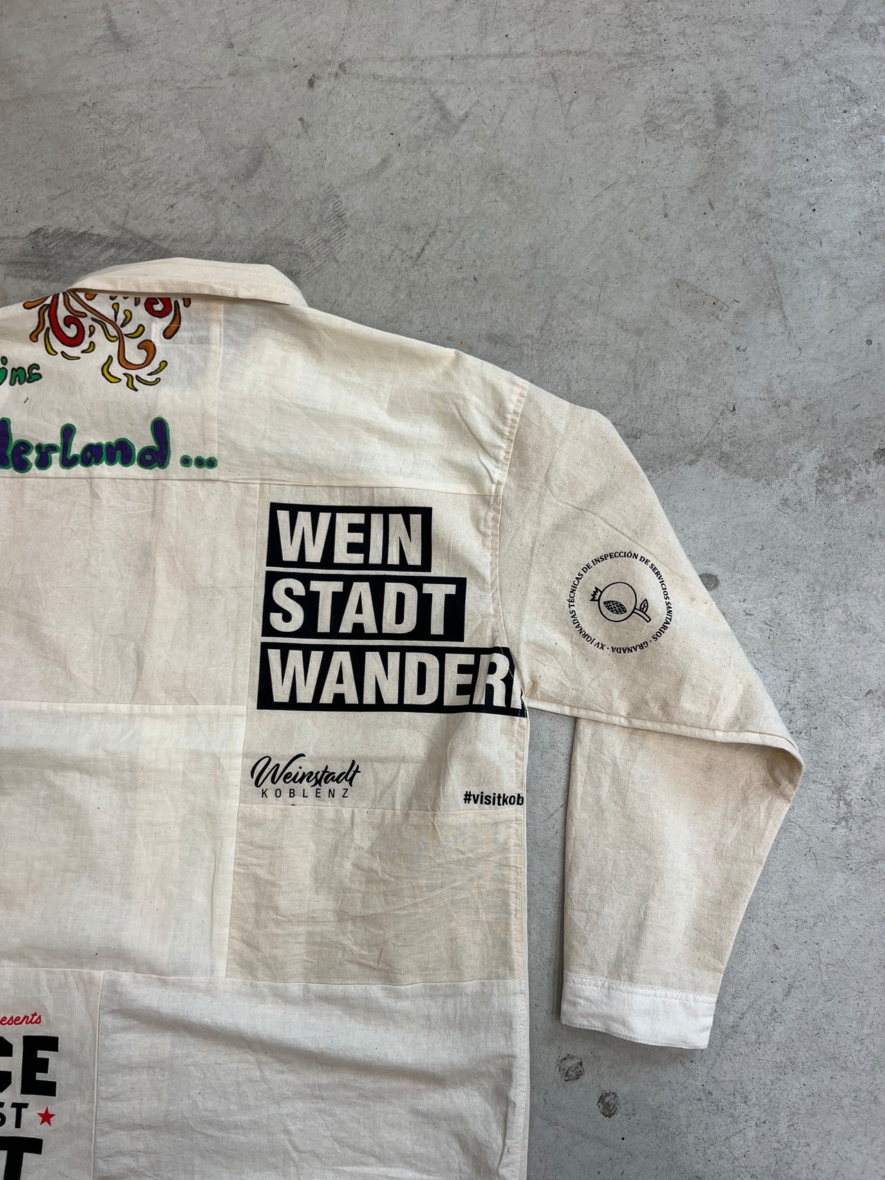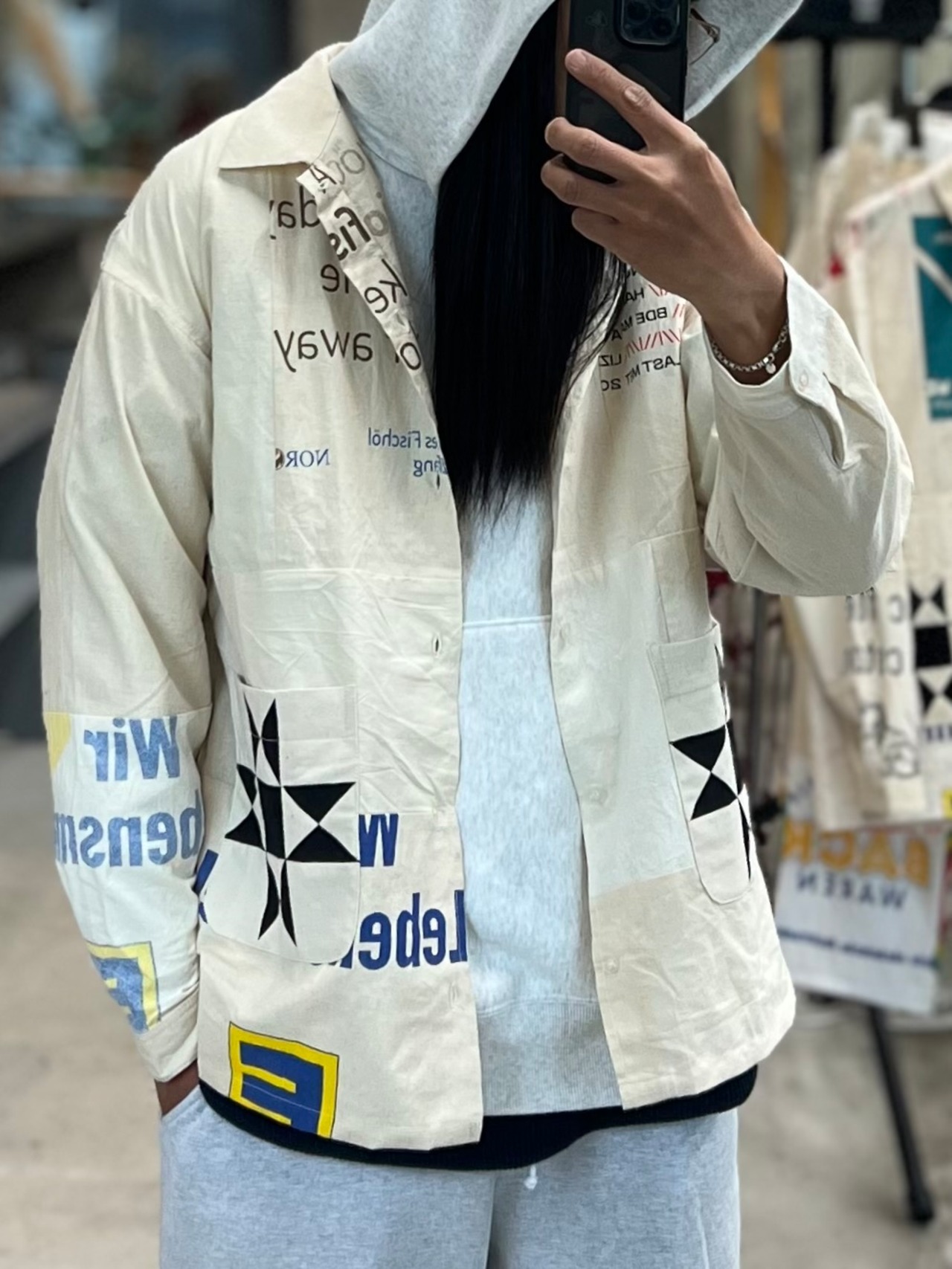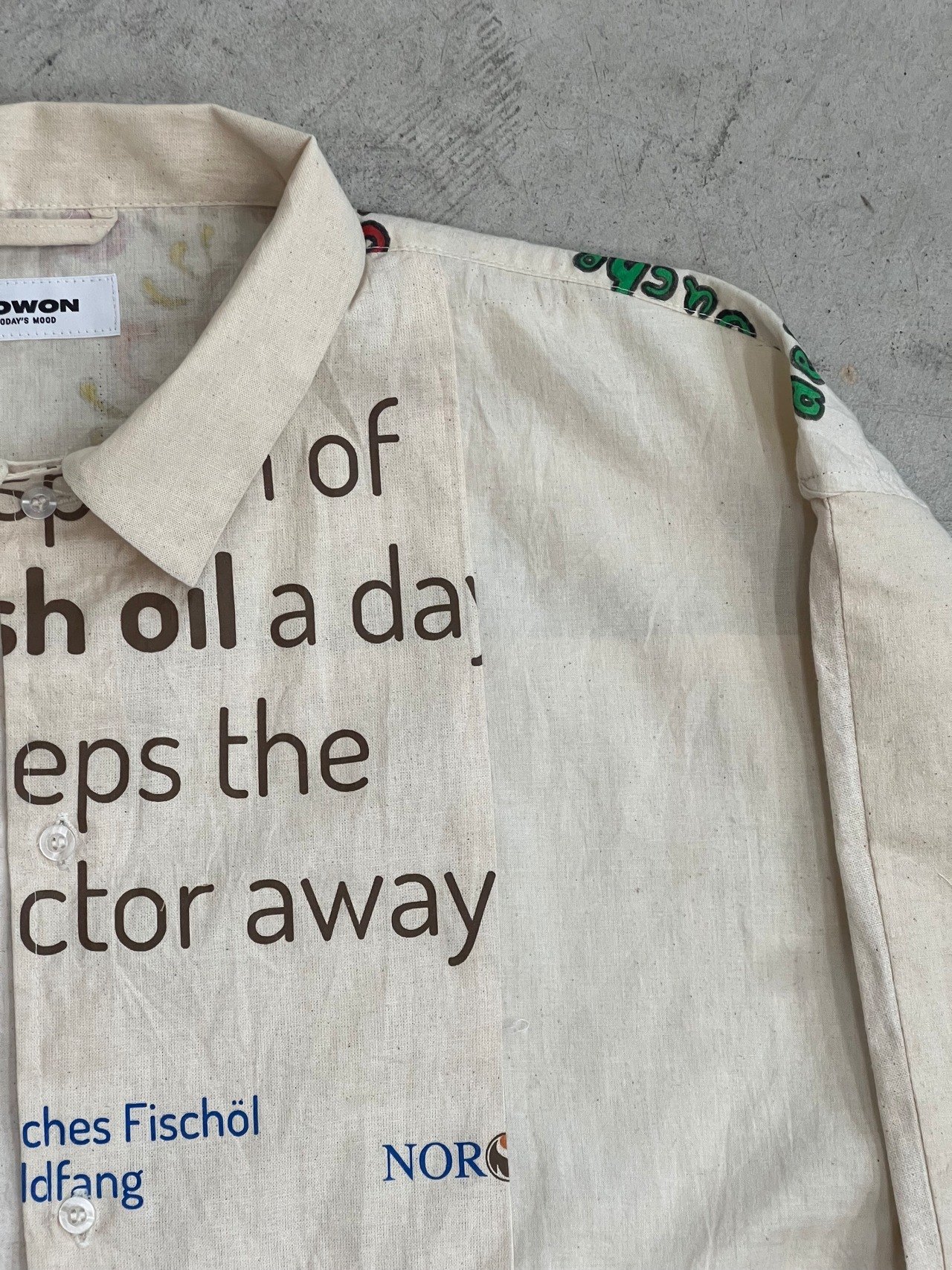 NOWON REMAKE "SOUVENIR BAG COVERAL SHIRT "のご紹介です!こちらはスーベニアバッグを活かしてリメイクされたカバーオール型のシャツです。お土産用エコバッグの魅力を再構築し、唯一無二のアイテムとして仕上げました。