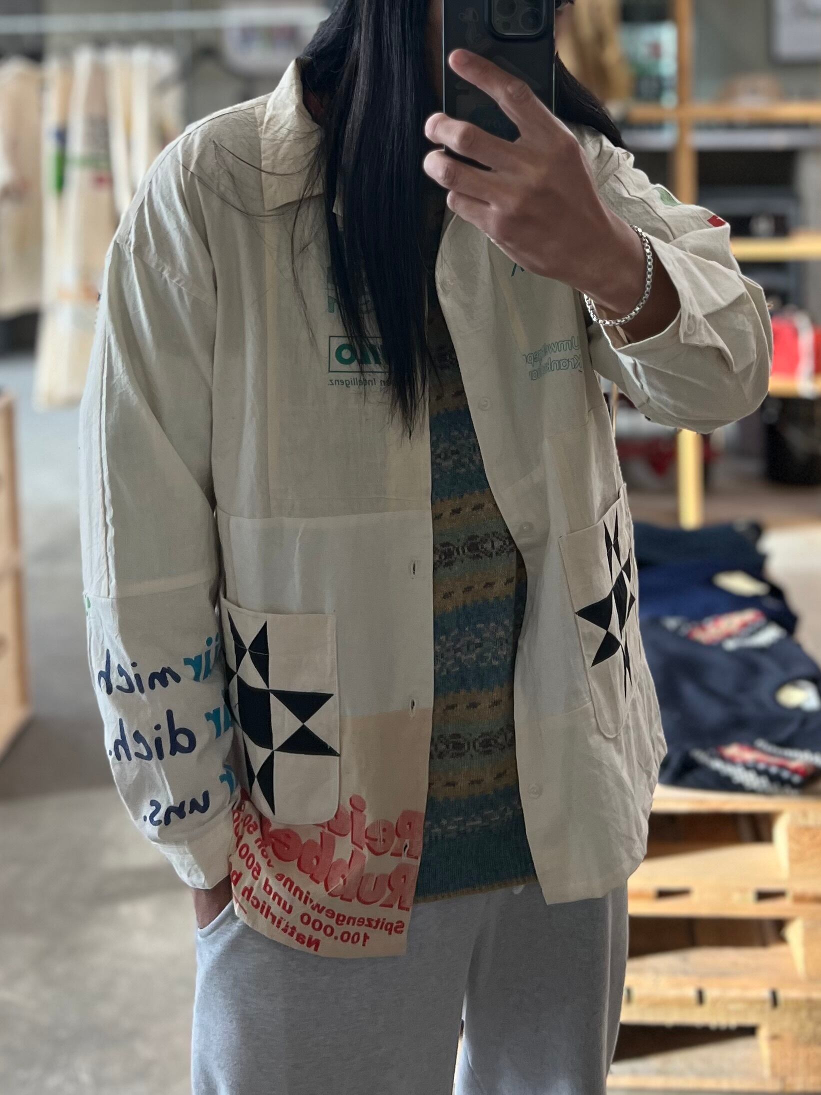 NOWON REMAKE "SOUVENIR BAG COVERAL SHIRT "のご紹介です!こちらはスーベニアバッグを活かしてリメイクされたカバーオール型のシャツです。お土産用エコバッグの魅力を再構築し、唯一無二のアイテムとして仕上げました。